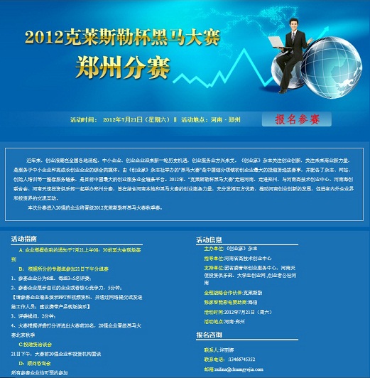 2012年7月21日,我公司應約參加了2012克萊斯勒杯黑馬大賽鄭州分賽。參賽過程中,我公司抱著支持推動河南創(chuàng)業(yè)創(chuàng)新的發(fā)展,促進省內(nèi)外企業(yè)界和投資界交流互動的態(tài)度,充分發(fā)揮企業(yè)優(yōu)勢、宣揚鼎力文化、展現(xiàn)企業(yè)實力,獲得了在場評委和嘉賓的一致好評,成功榮獲了2012克萊斯勒杯黑馬大賽鄭州分賽第一名,取得了晉級2012克萊斯勒杯黑馬大賽秋季賽的資格。